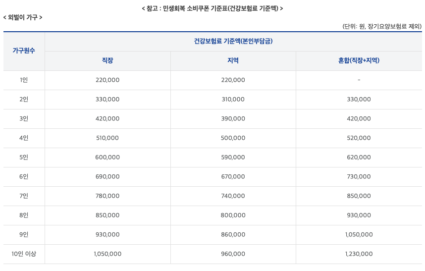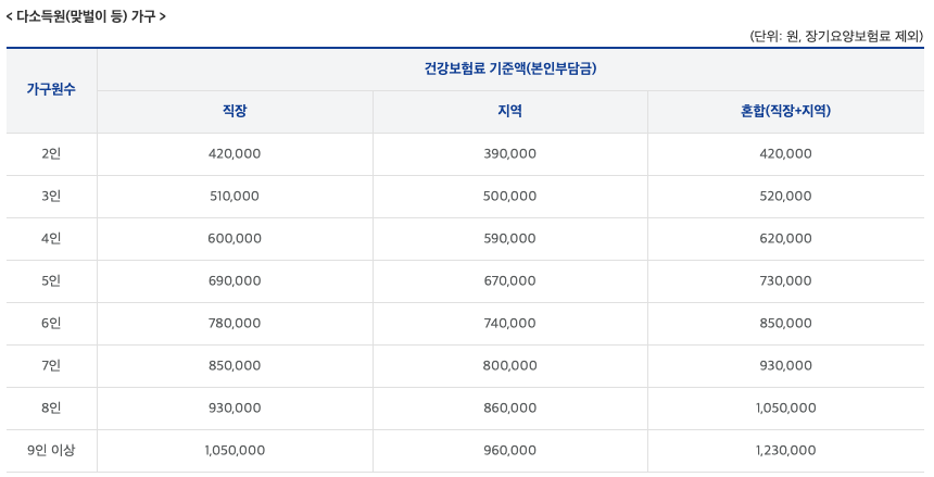 - 핵심: 우리 가구의 가구원 수에 따른 '직장가입자', '지역가입자', '혼합' 가구별 건강보험료 본인부담금 합산액이 기준표 이하인지 확인하는 것이 중요합니다.