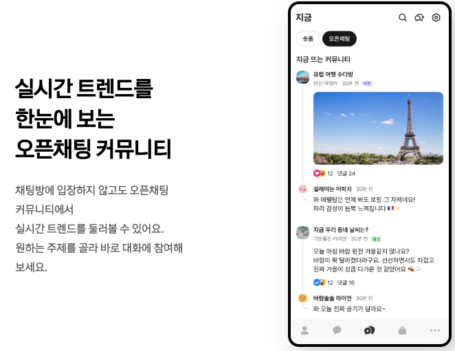 - 관심 주제별 대화를 피드 형태로 소비 가능 (방 입장 없이도 확인 가능)