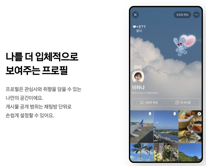 단순 사진·상태 메시지를 넘어, 다양한 개성을 표현할 수 있는 입체적 프로필을 제공 합니다.