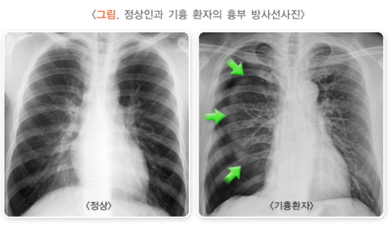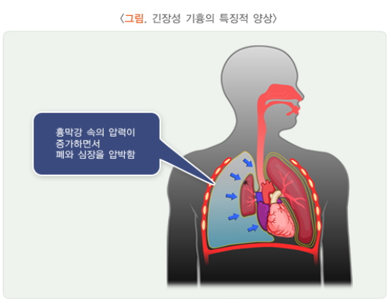 - 기흉이 심하거나 긴장성으로 진행되면 혈압 저하, 의식 저하, 응급 상황으로 발전